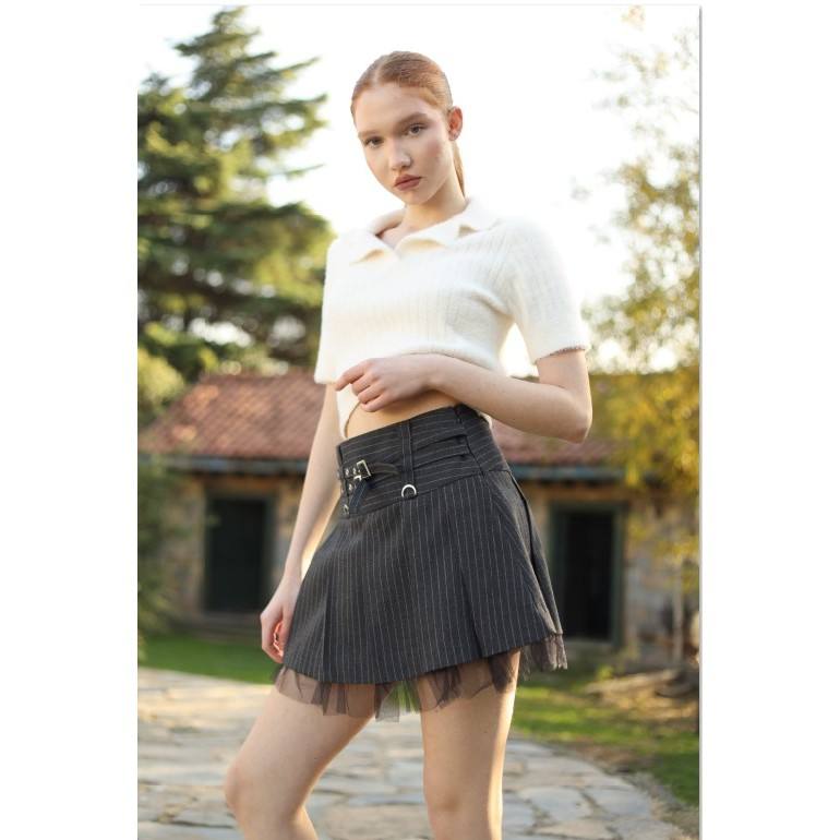 Top a coste bianche e gonna mini grigia a righe con fibbie
