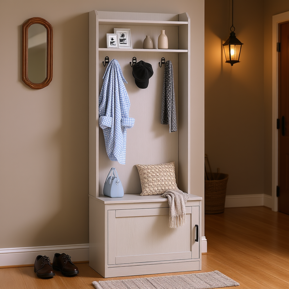 Appendiabiti da Ingresso Rustico Bianco con Panca, Scarpiera e 3 Ganci, 2 Ripiani, in MDF, Autoportante