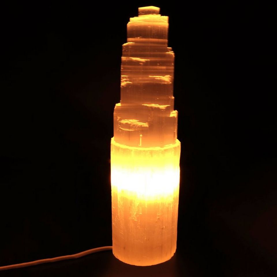 White Selenite Lamp 3-4 kg Carved Tower Shape Warm Light Wooden Base Home Decor Morocco 28 cm 15W