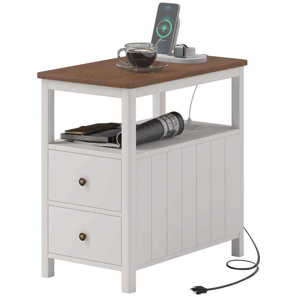Tavolino Laterale Bianco con Stazione di Ricarica e Porte USB, Consolle Stretta con Cassetti per Soggiorno