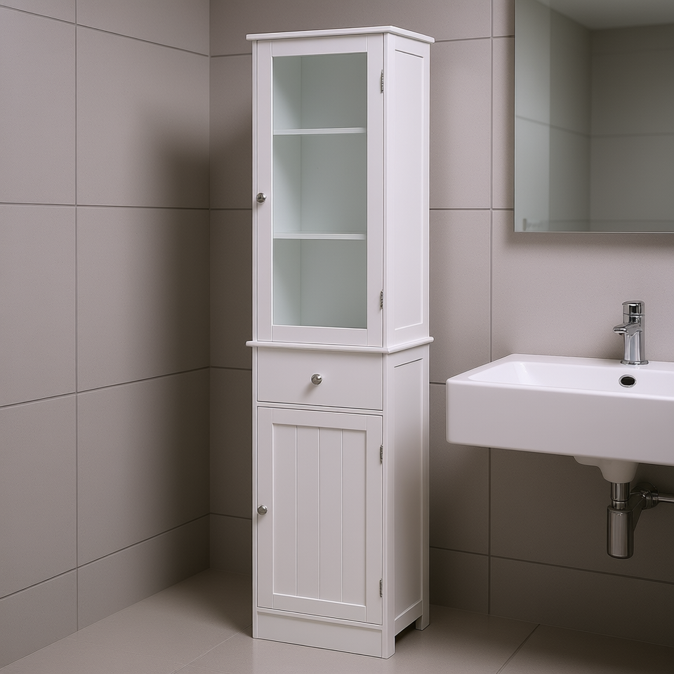 Mobiletto da Bagno Bianco Sottile e Alto con Anta in Acrilico, Cassetto e Ripiani per Spazi Ristretti