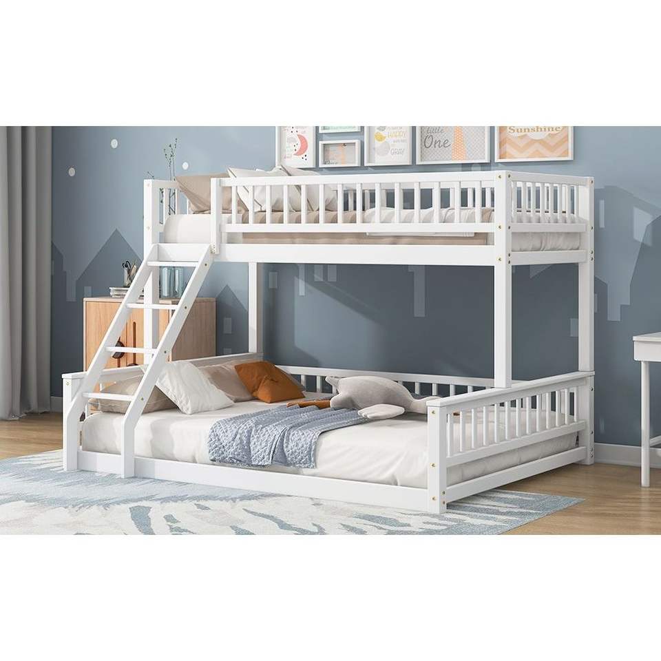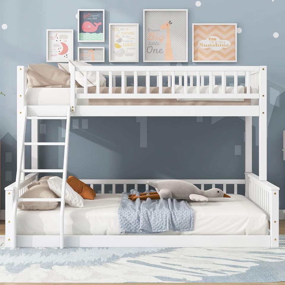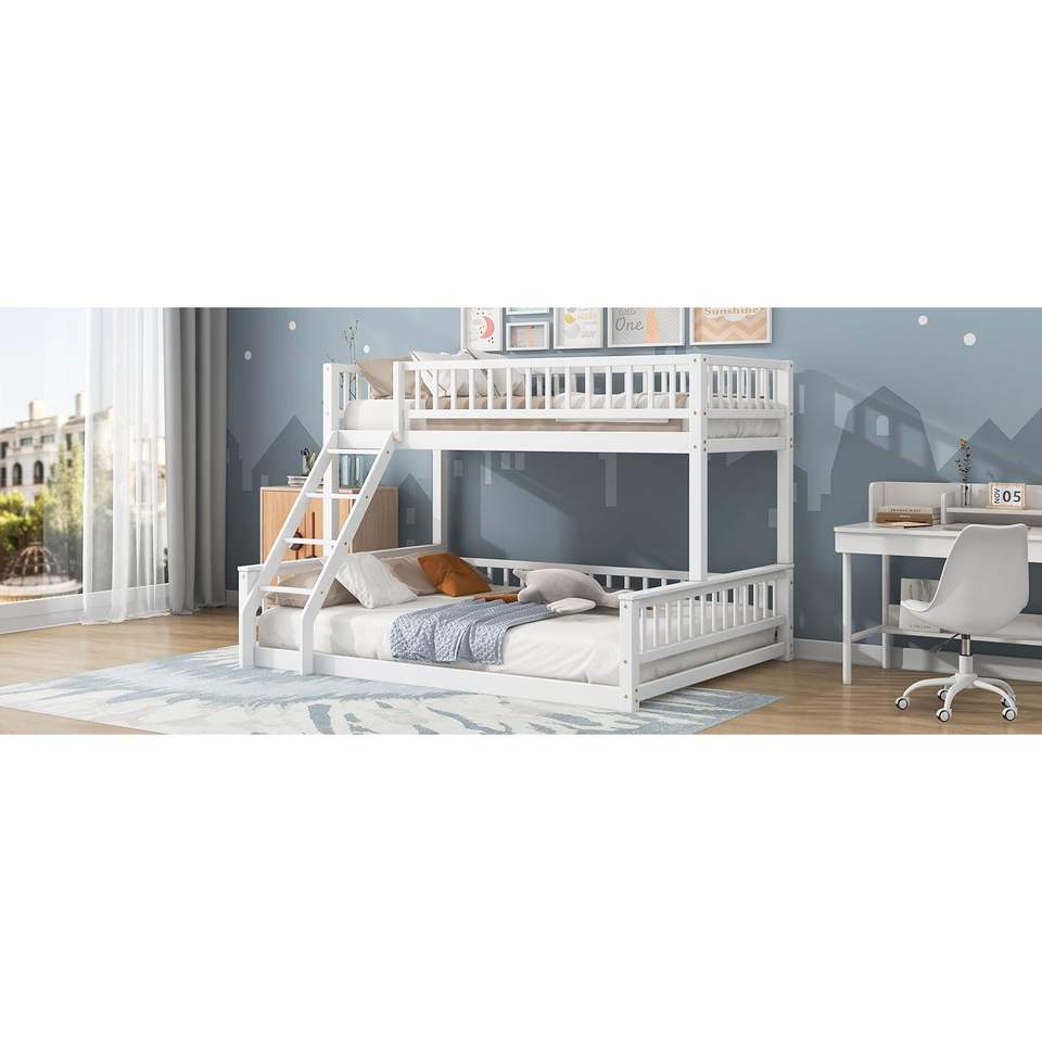 Letto a castello bianco Twin XL sopra Queen con scaletta e sponde di sicurezza