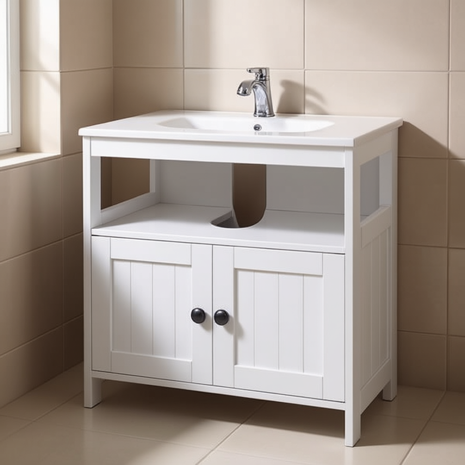 Mobiletto Bianco Sottolavabo con Doppia Anta, Scaffali per Bagno 48 Pollici, Stile Rustico in Legno, Autoportante