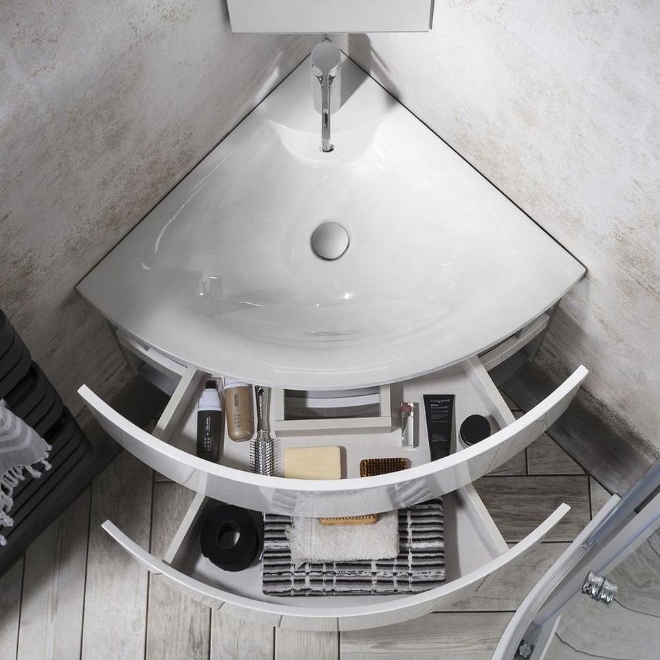 Vanità del bagno ad angolo anteriore curva montata a parete bianca con cassetti
