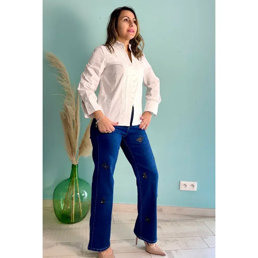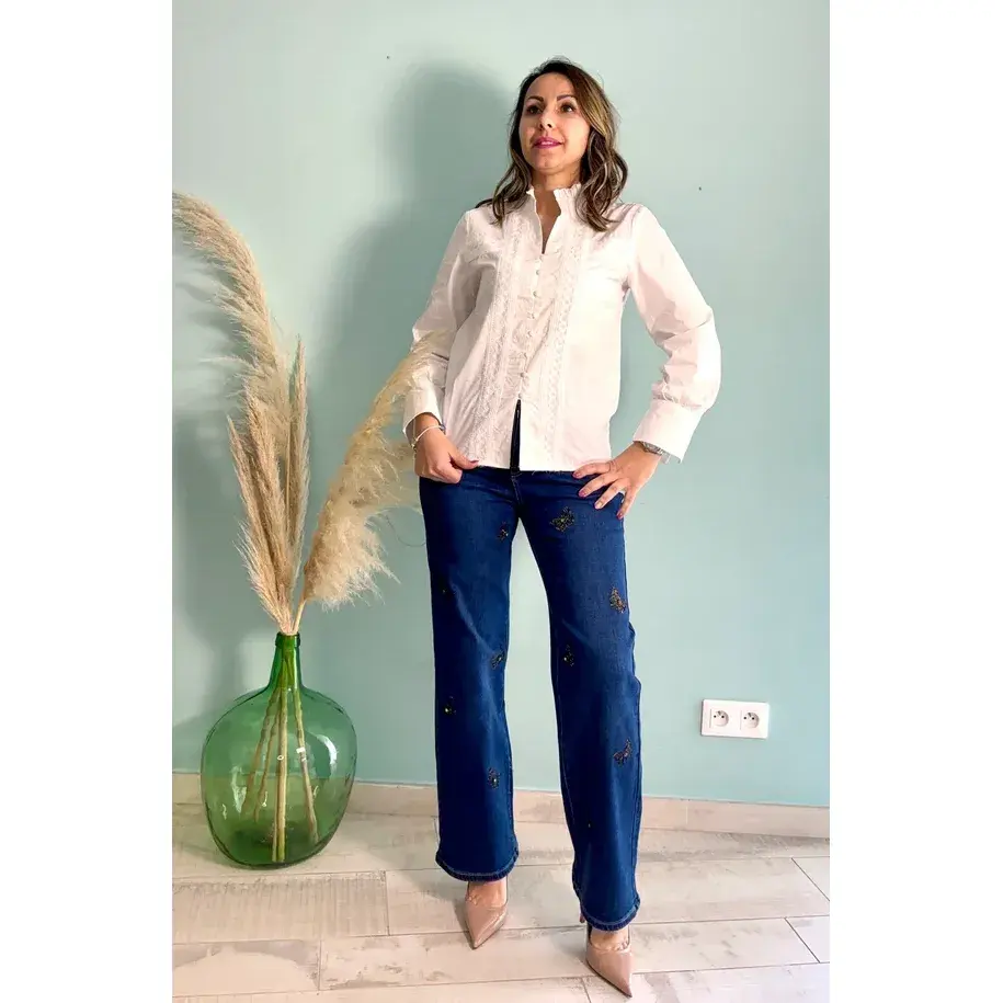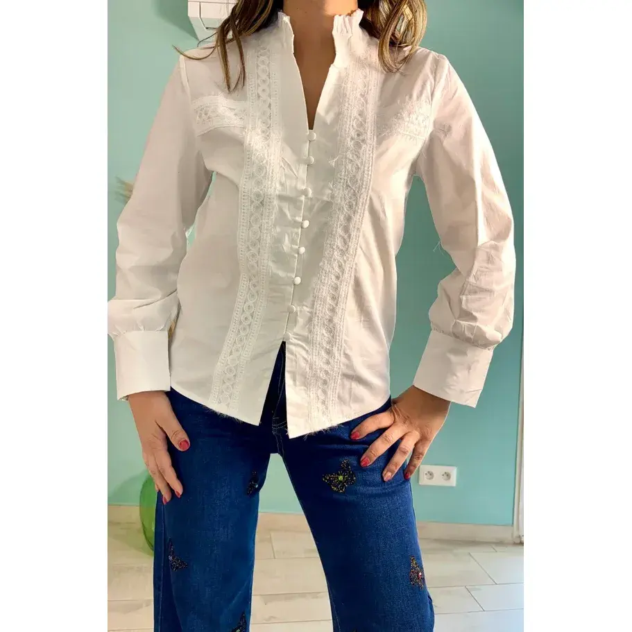 White Women's Long Silk Top Floral Embroidered Stand Collar XL Size Formal Top Lace Decoration Autumn Season Viscose Material