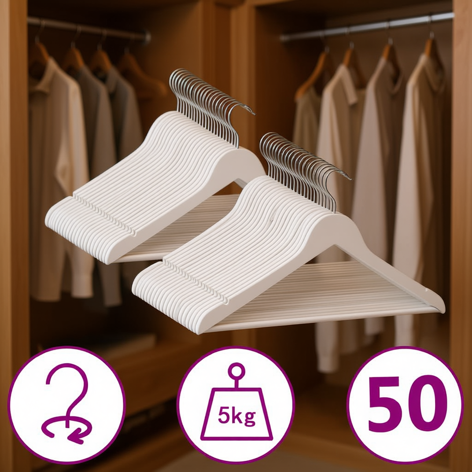 White Wood Hangers Set Of 50 Non Slip Design For Closet Clothing Storage Organizer Standard Size Heavy Duty 5kg Capacity
