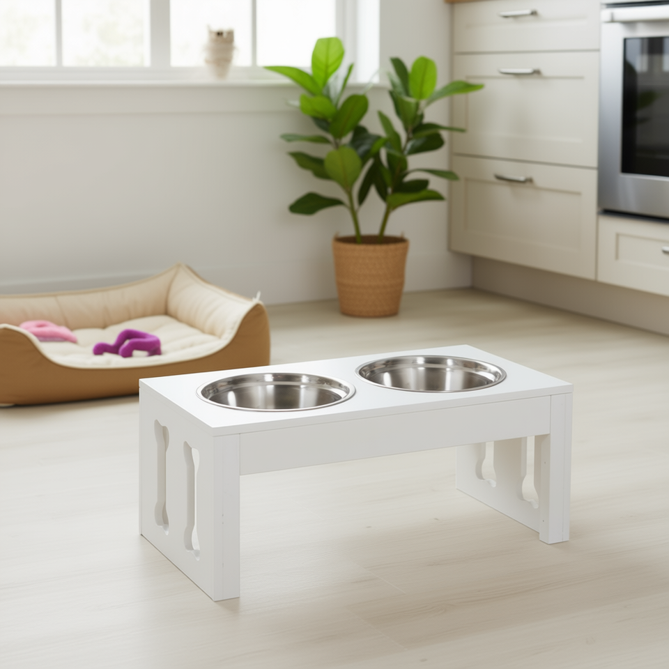 White Wooden Elevated Dog Feeding Station With Stainless Steel Bowls For Indoor Dogs Modern Design 2 In 1 Pet Bowl Stand