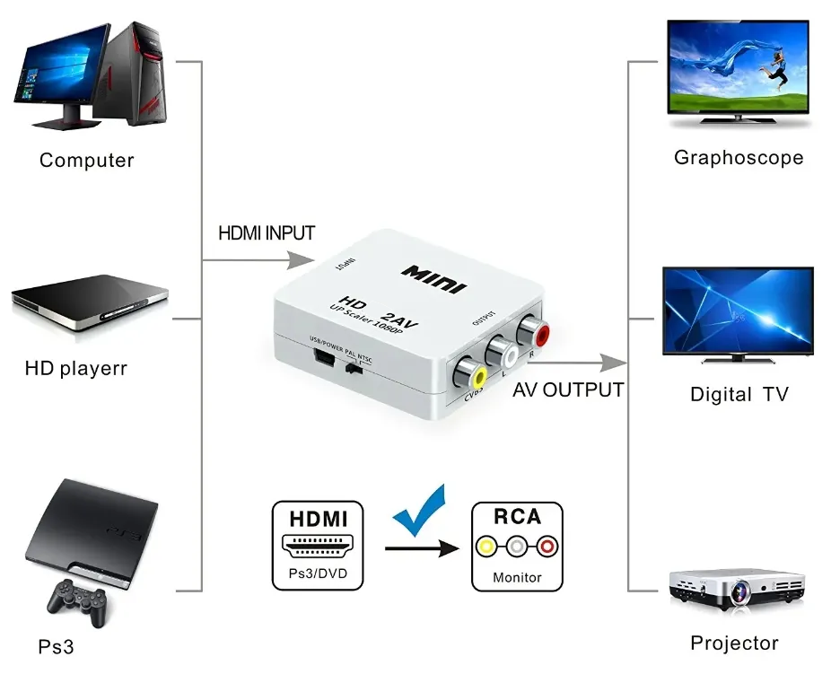 All'ingrosso adattatore Video composito 1080P HD HDTV2AV AV/CVSB L/R Video Box Converter Video separatori convertitori supporto NTSC