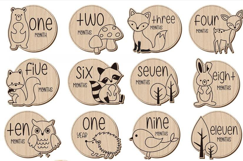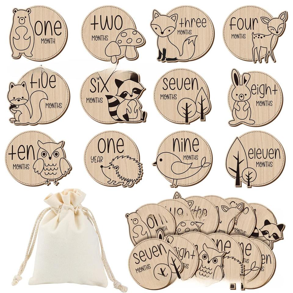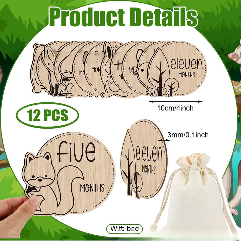 Ingrosso 12 pezzi simpatici fai da te segni di animali in legno pietra miliare del bambino annunci per Baby Shower decorazioni incise carte pietra miliare