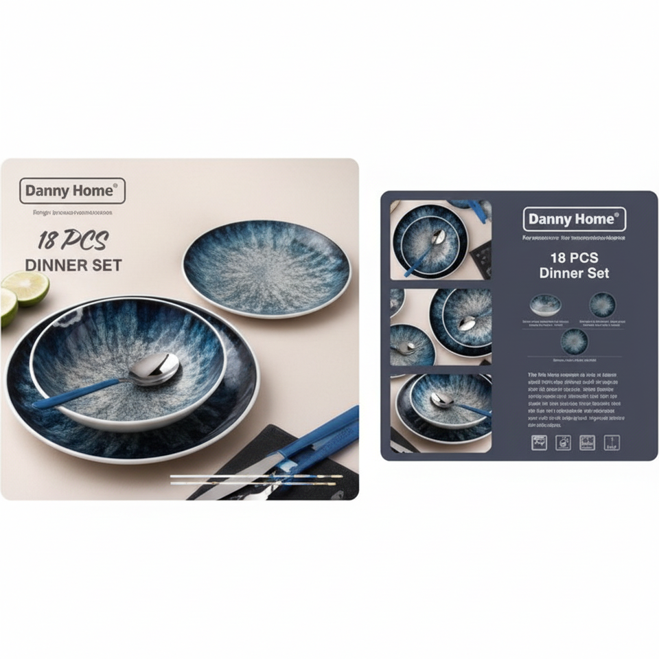 Commercio all'ingrosso 18 pezzi di ceramica blu Set di stoviglie 12 pz piatti cena ciotole posate per uso domestico sala da pranzo