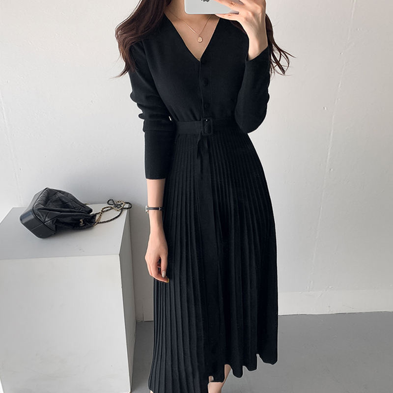 Wholesale 2026 Autumn Korean Chic French Elegant V-neck Single-breasted Lace-up Waist Slim Long-sleeved Pleated Knitted Dress