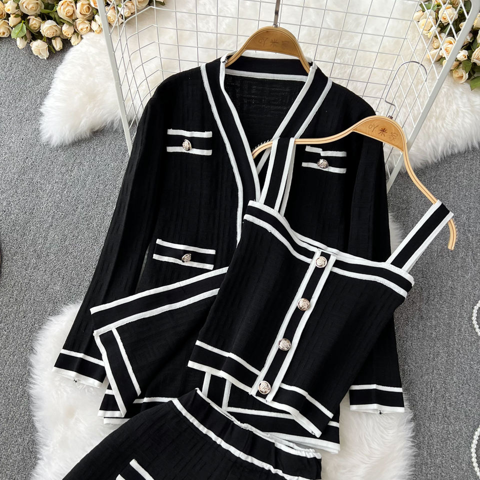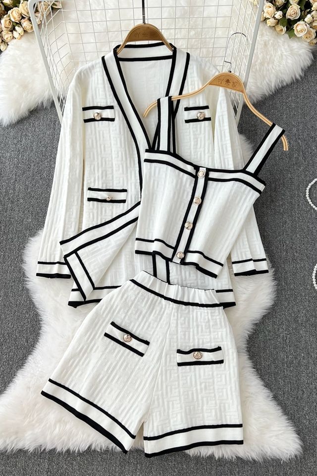 Set 3pz donna: cardigan a V, gilet con bretelle e shorts vita alta, poliestere/cotone, bianco/nero, taglia unica b64-82 v64-80 cm