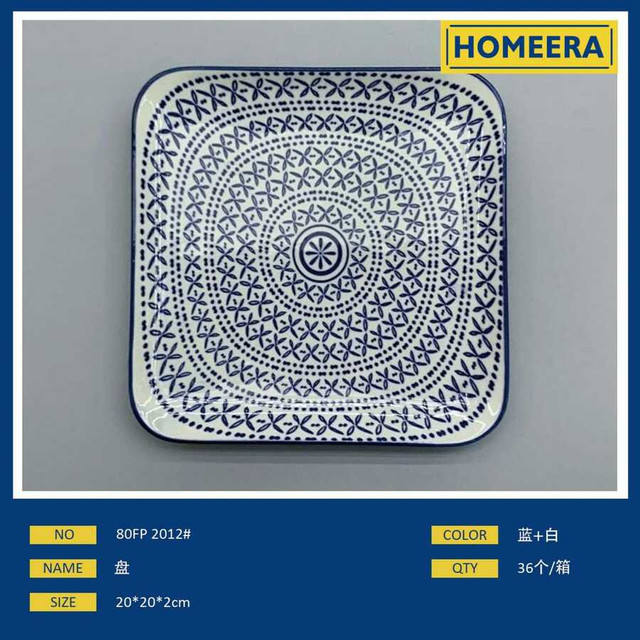Wholesale 20cm Blue White Ceramic Square Plate Customizable Design Restaurant Soup Plate Flat Bottom Direct Sale