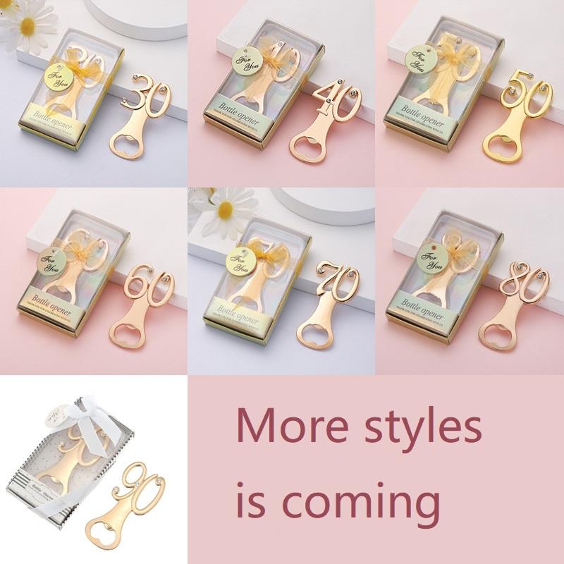 All'ingrosso 30 40 50 70 80 ° anniversario di compleanno souvenir Golden apribottiglie con il numero per gli ospiti