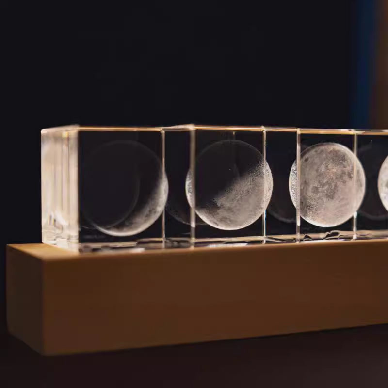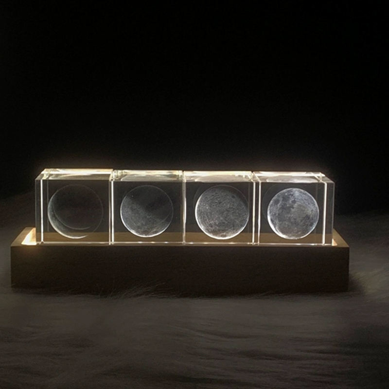 Wholesale 3D Laser Engraving Moon Light Luminous Home Decor Crystal LED Small Night Lamp 4 Moon Light a Set With Wooden Base