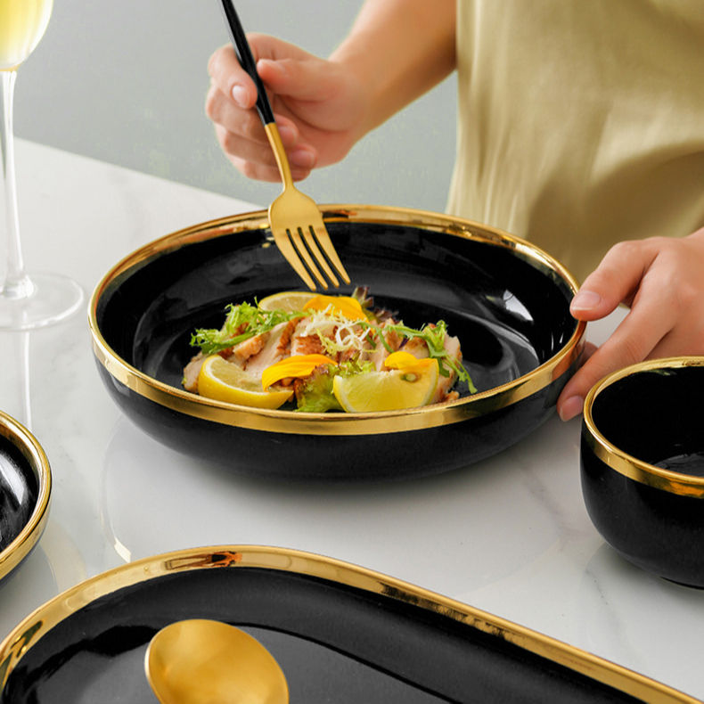 Wholesale 7.5/8/9/10/12inch Serving Dishes Plates Porcelain Luxury Bright Black and Gold Rimed Ceramic Tableware for Home Use