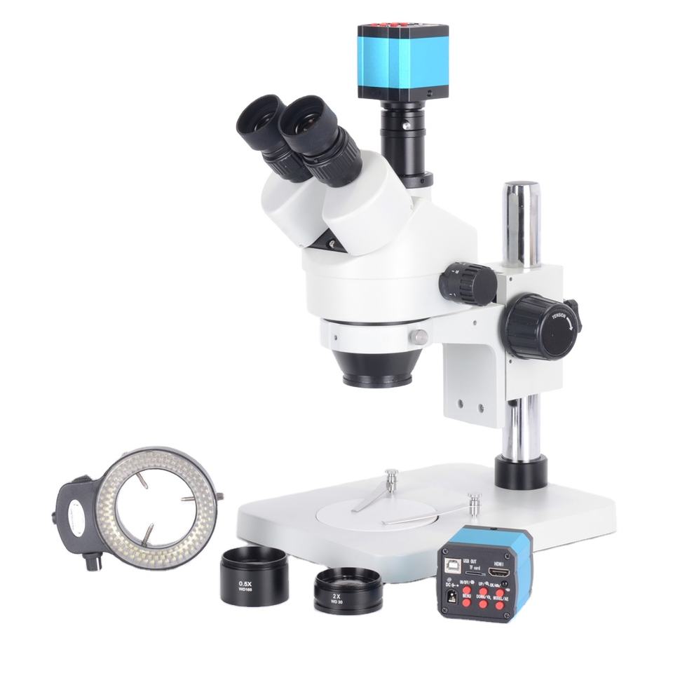 Microscopio Binoculare Industriale con Zoom 7X-45X, Fotocamera da 14MP, Luce LED 144, Lente Obiettivo Ausiliaria 0.5X-2X