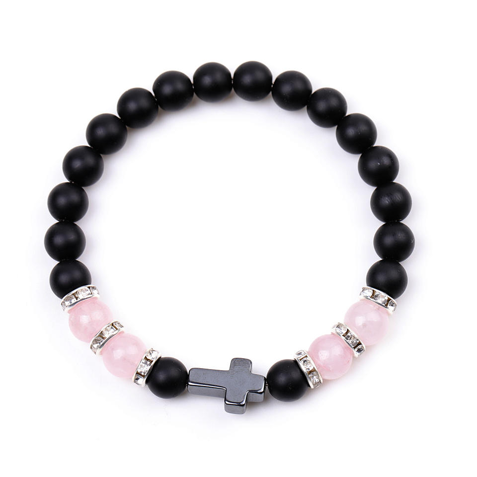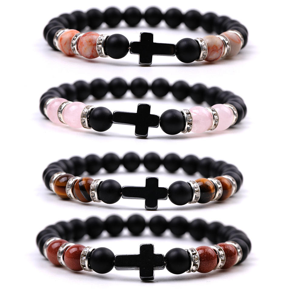 Wholesale 8mm Matted Natural Stone Rose Quartz Tiger's Eye Gold Plated Cross Bracelet Yoga Healing Balance Bangle for Men Women