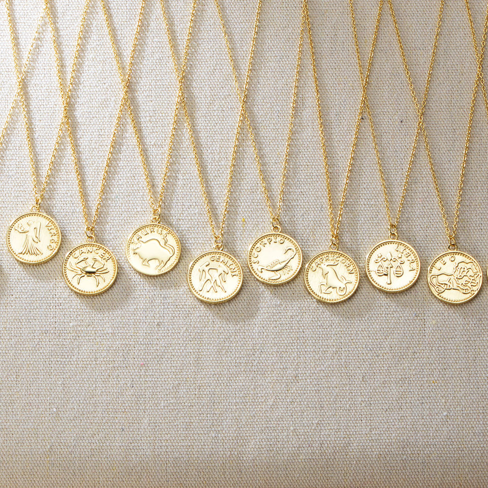 Wholesale 925 Sterling Silver Gold Plated Jewelry Dainty Choker Astrology Zodiac 12 Signs Round Coin Horoscope Pendant Necklace