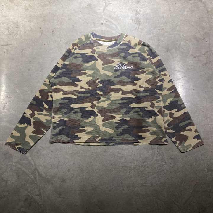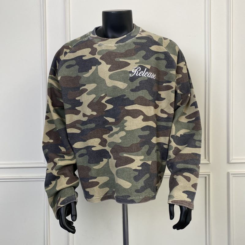 Felpa termica oversize da uomo acid wash camo con stampa grafica, in maglia waffle, maniche lunghe, materiale premium, ingrosso