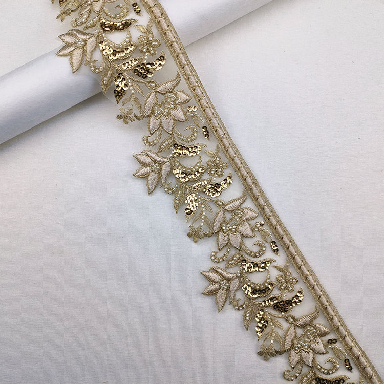 Commercio all'ingrosso africano Appliques filo oro tessuto di pizzo produttore di perle bianche in Tulle francese ricamato in pizzo 3d