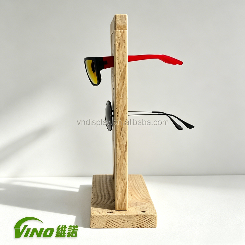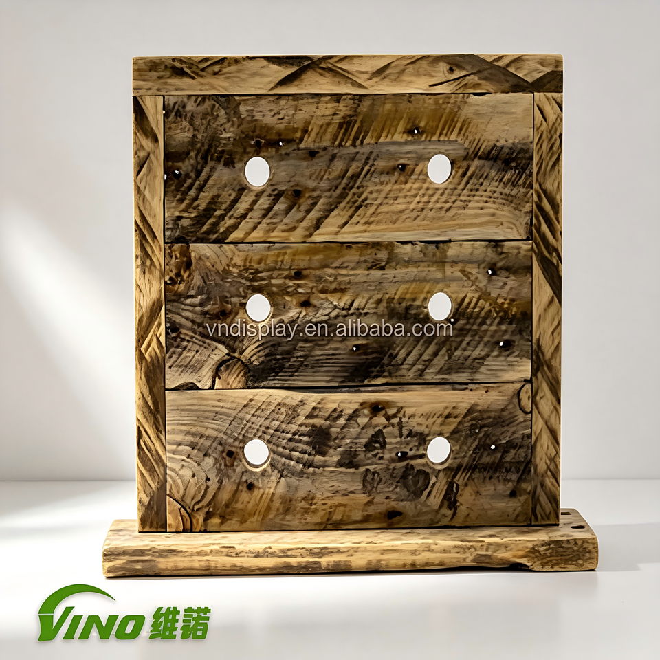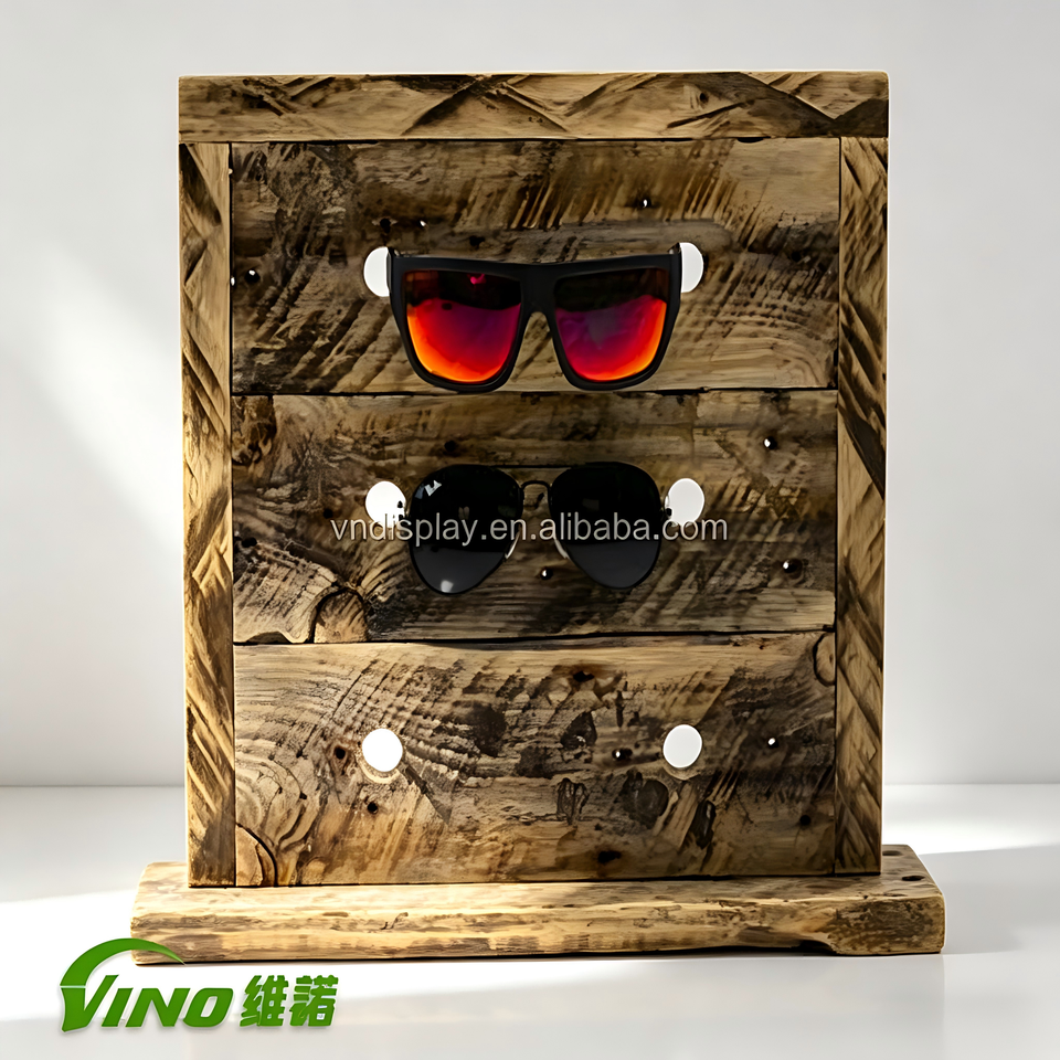 Espositore da banco bifacciale in legno rustico invecchiato per occhiali da sole, con logo inciso, per 4 occhiali da sole - Vendita all'ingrosso