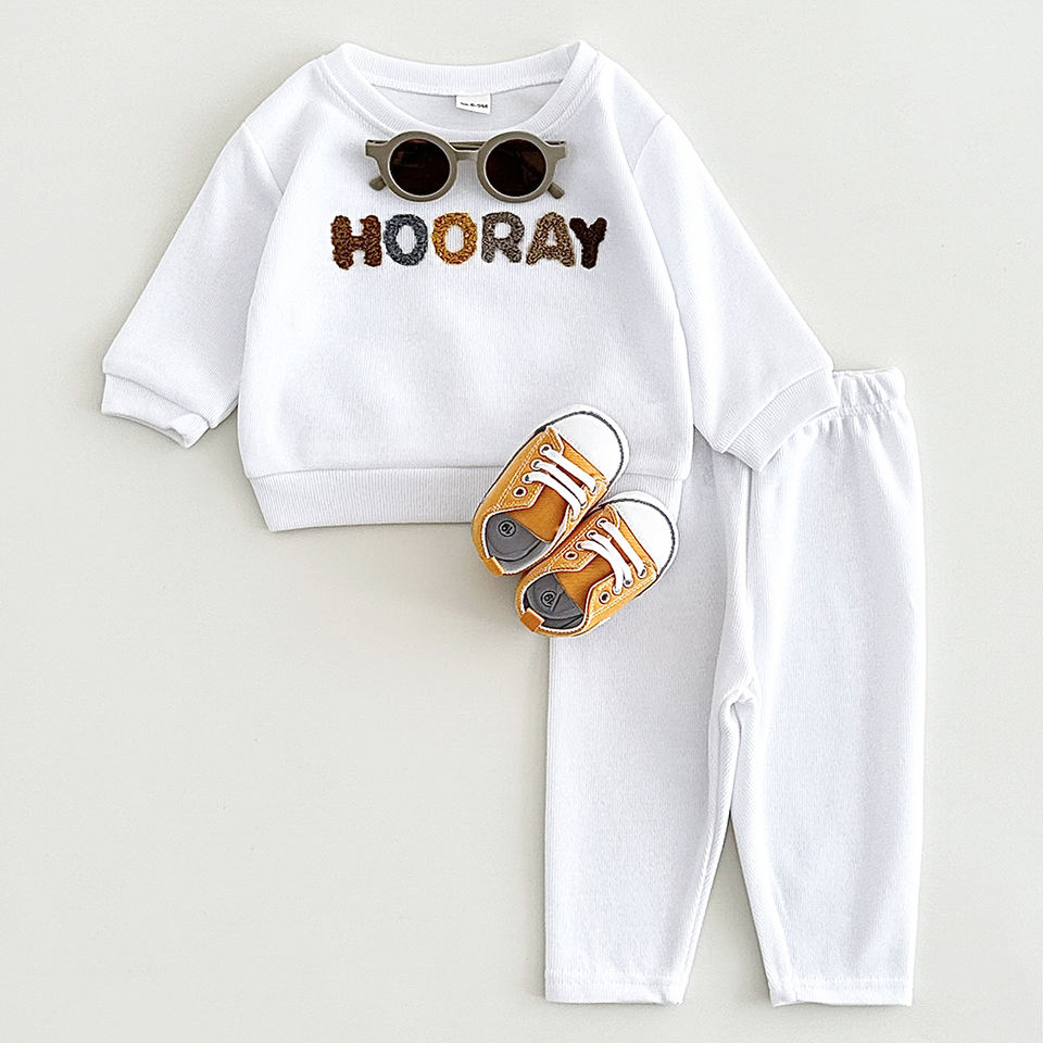Set neonato 2 pezzi manica lunga e pantaloni, 65% cotone/35% poliestere, ricamo a lettere, taglie 6-9M/9-12M/12-18M/18-24M/2-3Y