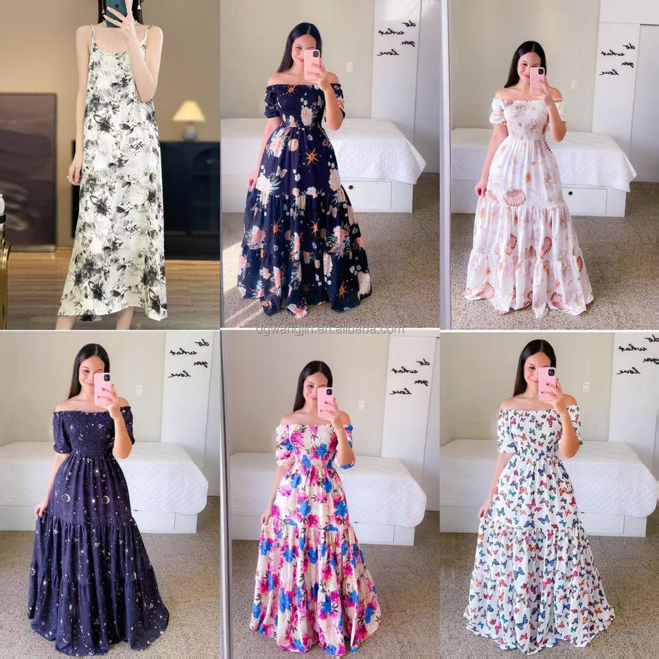 Wholesale Beach Vacation Blue Floral Camisole Dress for Women in Summer 2025, Knitted Sweater Temperament, Chiffon Beach Dress