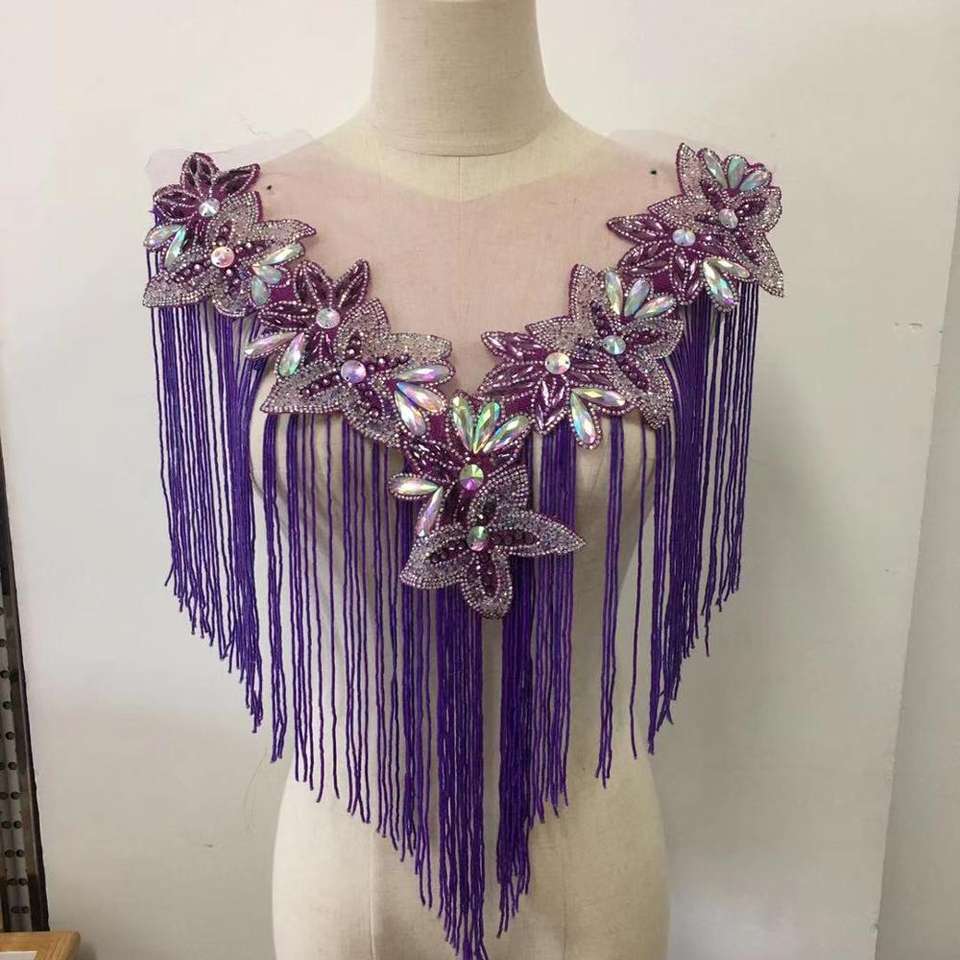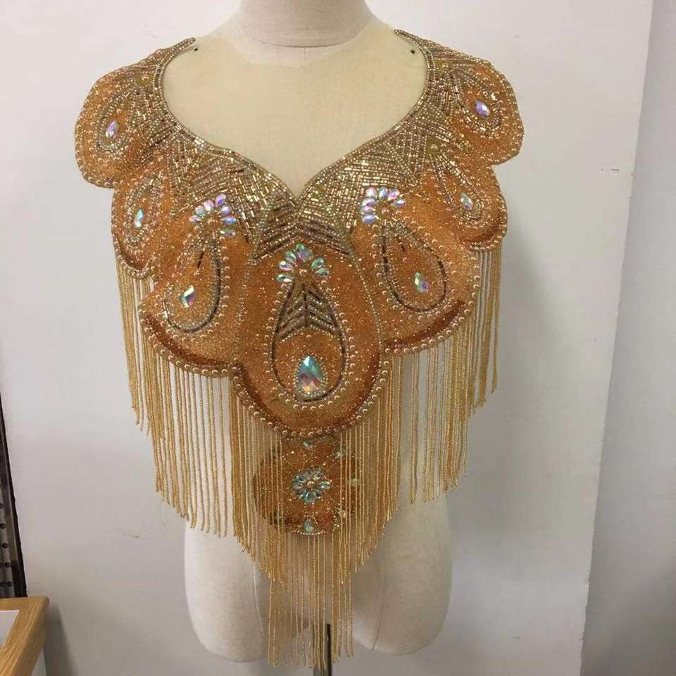 Wholesale Beaded Evening Dress Tassel Fringe and Trims Collar Neckline Gold Rhinestone Applique