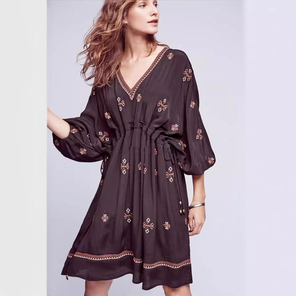 Wholesale Boutique Women Floral Embroidered 3/4 Sleeve Mini V-neck Embroidered Floral Simple Loose Belt-wrapped Waist Dress
