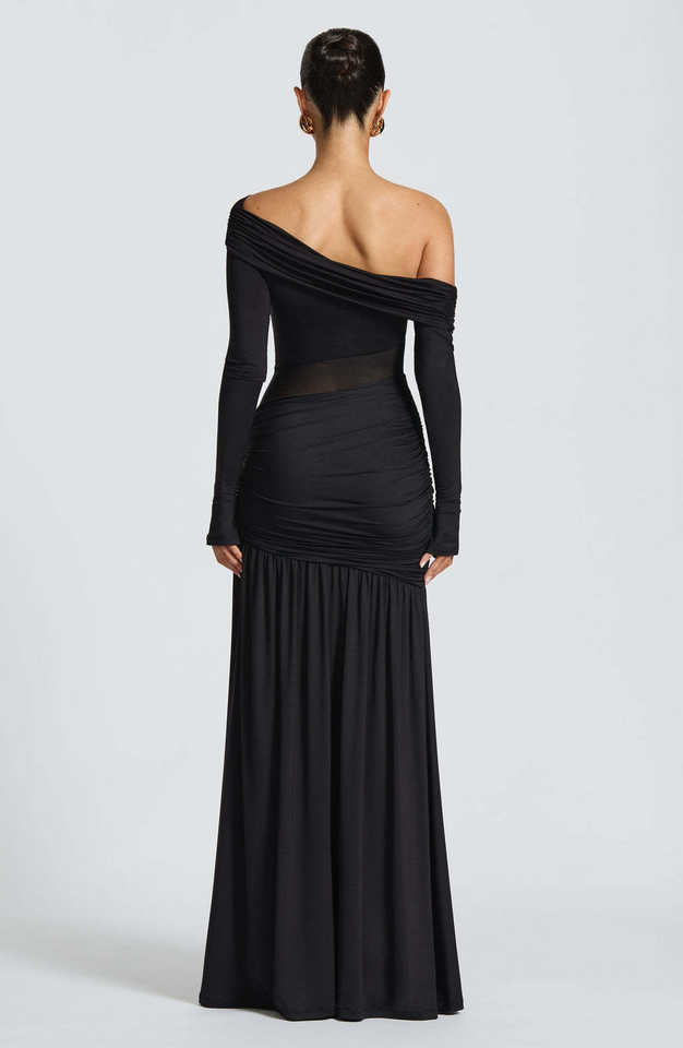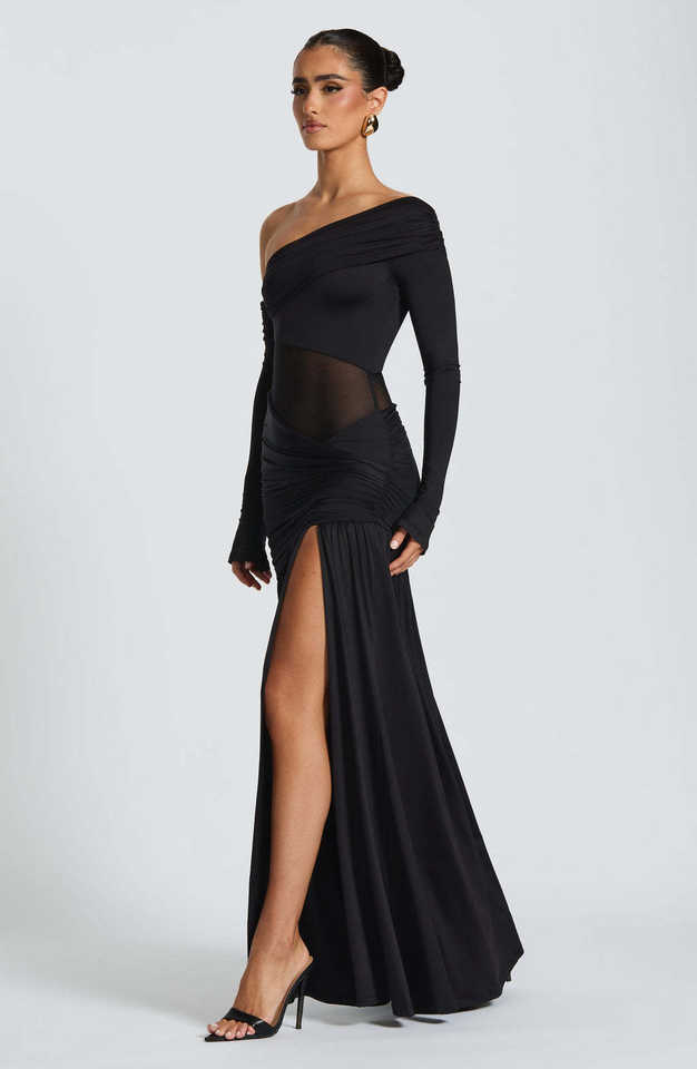 Shantou Junya Garment Abito spalle scoperte in poliestere ed elastan per donna, drappeggio ai fianchi con spacco e inserti in rete, per feste estive; min. 50 pezzi