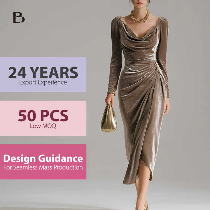 Wholesale Clothing OEM/ODM Factory High-quality Luxury Draped Elegant Velvet Midi Dress Limited-Edition Low MOQ 50pcs for Women