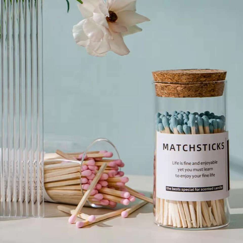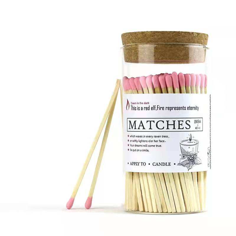 Barattolo di fiammifero in legno lungo di vetro rosa di sicurezza in bottiglia