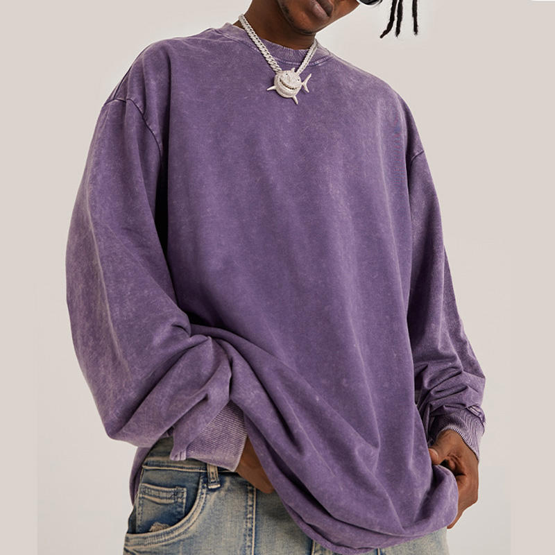 All'ingrosso felpa oversize in cotone 100% in bianco con scollo a squadretto oversize da uomo viola Streetwear T-shirt a manica lunga