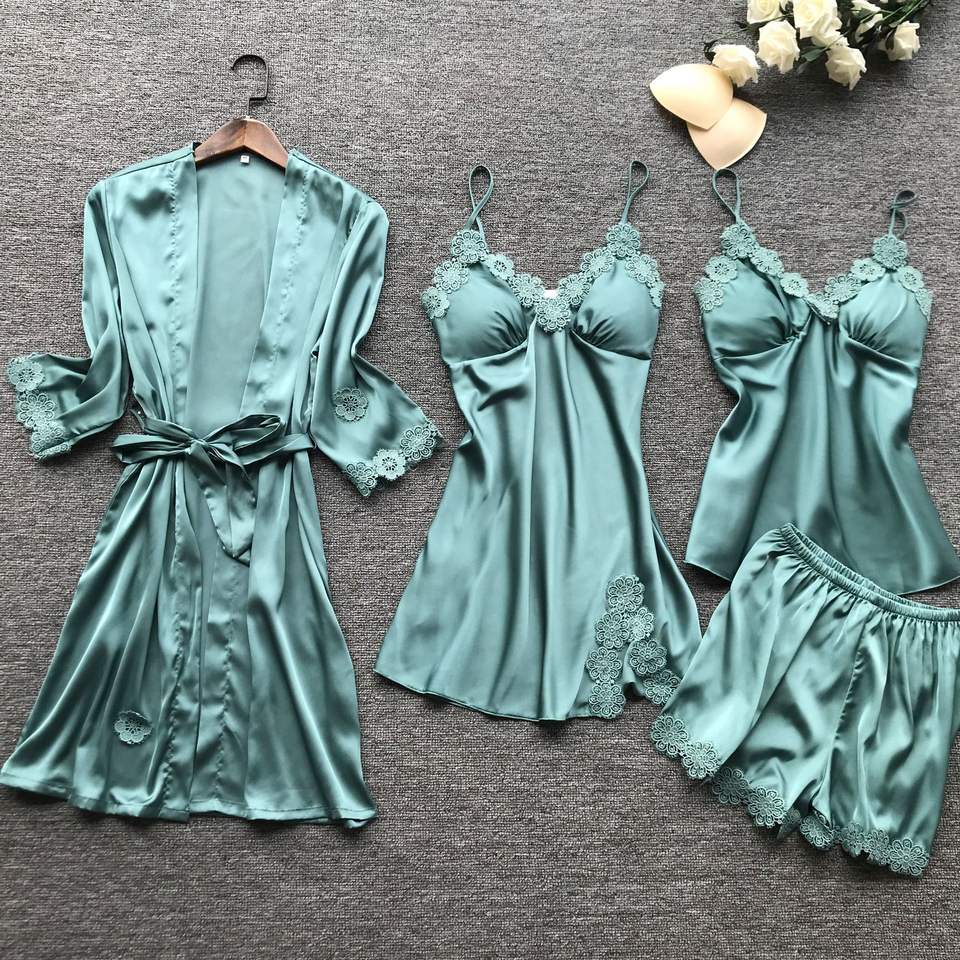 Wholesale Custom Casual Silky Satin Nighty Sets Women's 4 Piece Pajamas Sleepwear