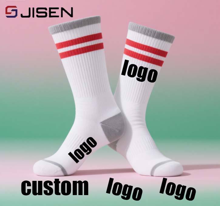 Design personalizzato all'ingrosso logo Jacquard a maglia Logo Anti-sudore e asciugatura rapida Unisex Design Sport bianco calzini rossi