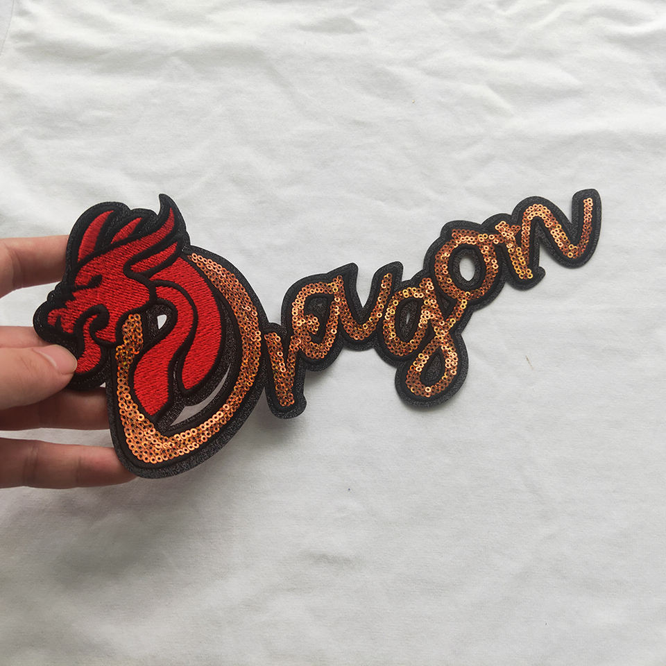 Wholesale Custom Eco-Friendly Embroidered Patches Club Team Name & Animal Dragon Letter Sequins on Iron-On for Clothing