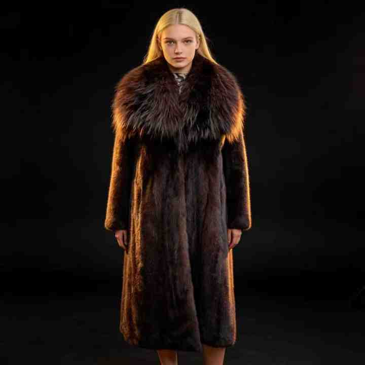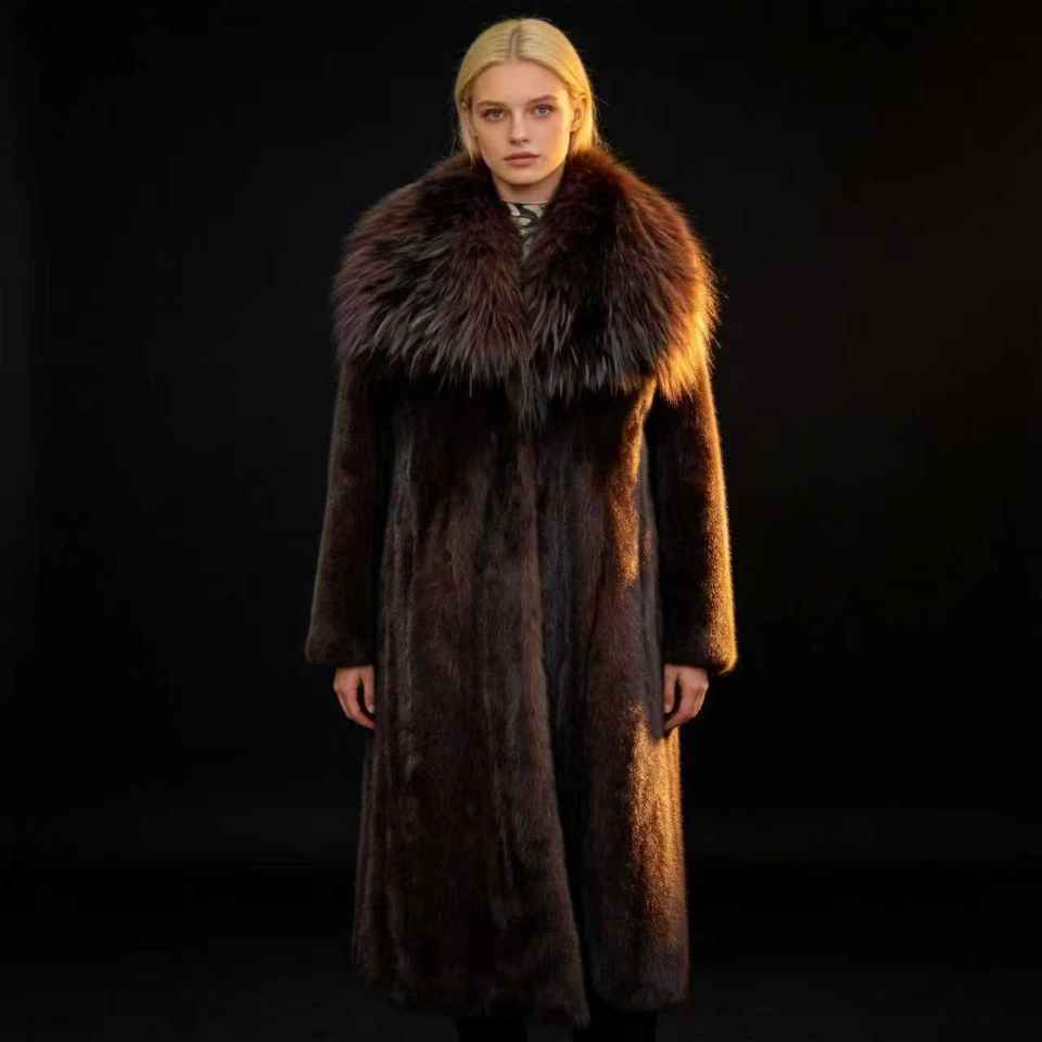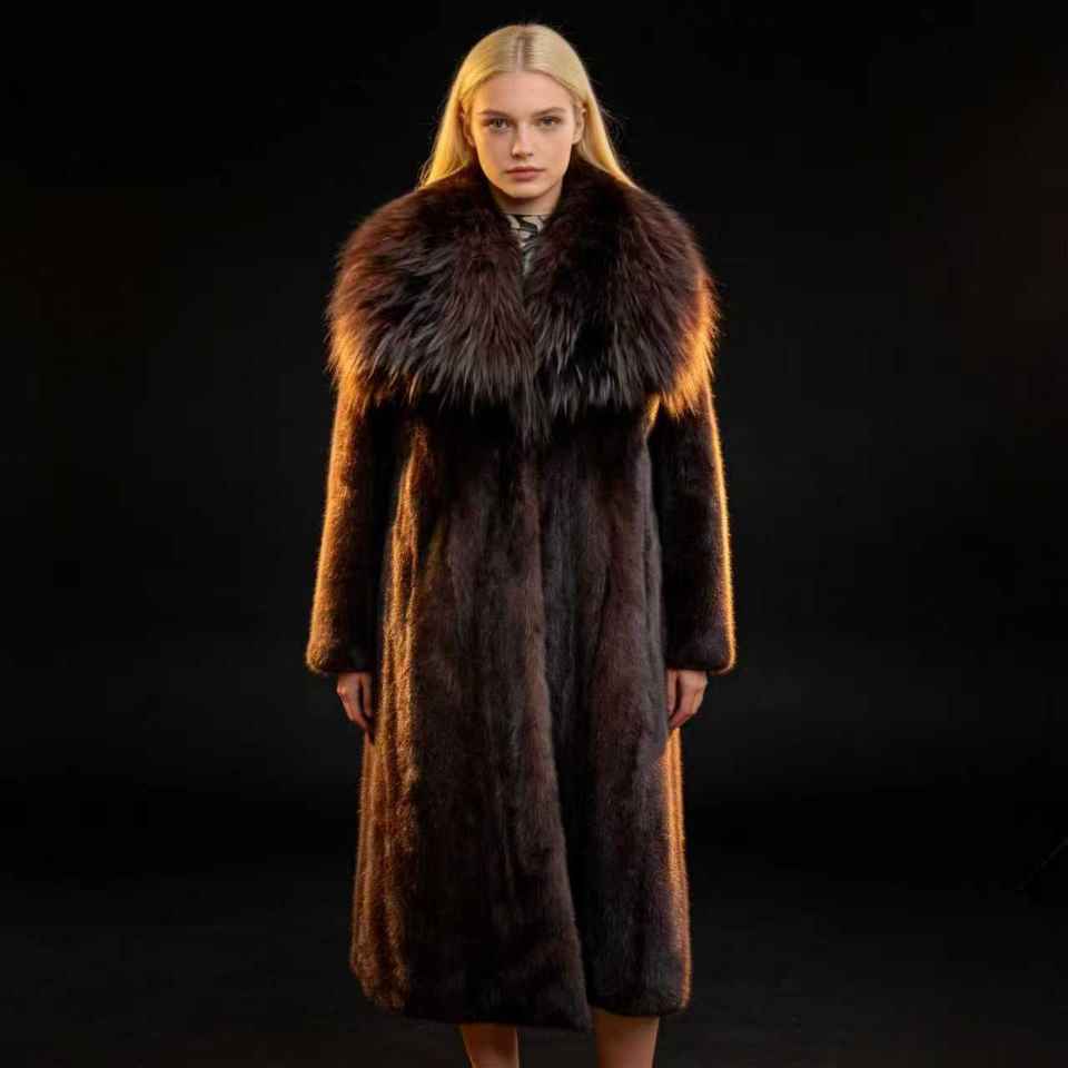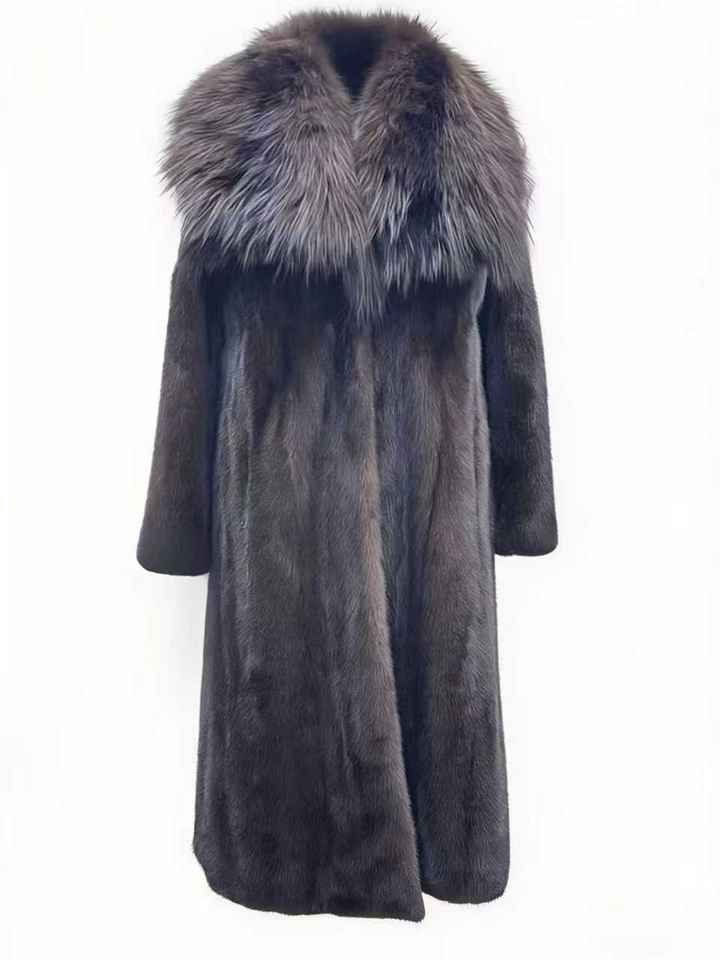 Pelliccia di visone lunga personalizzata all'ingrosso con collo in pelliccia di volpe