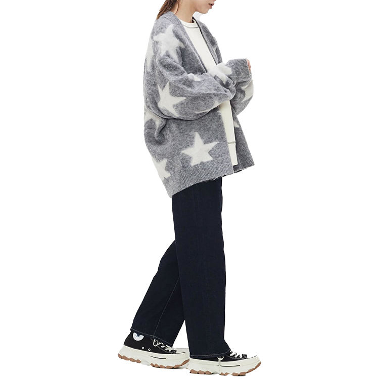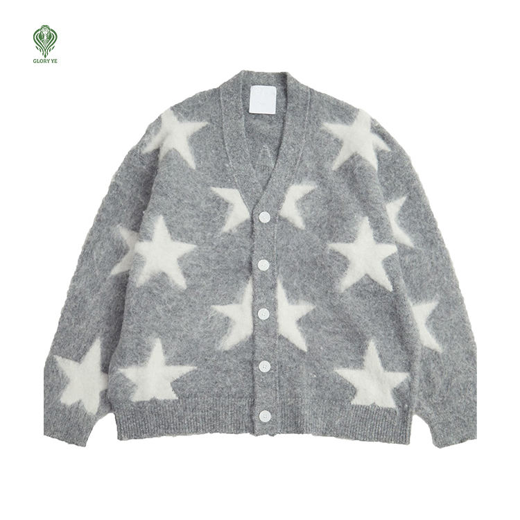 Wholesale Custom Loose Shaggy Fluff Star Knitwear Unisex Varisty Intarsia Jacquard Fleece Mohair Knit Cardigan Women'S Sweater