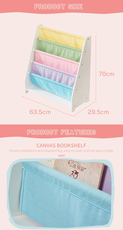 Espositore per Libri per Bambini Personalizzato all'Ingrosso, Libreria in Legno e Tela con Tasche per Riviste