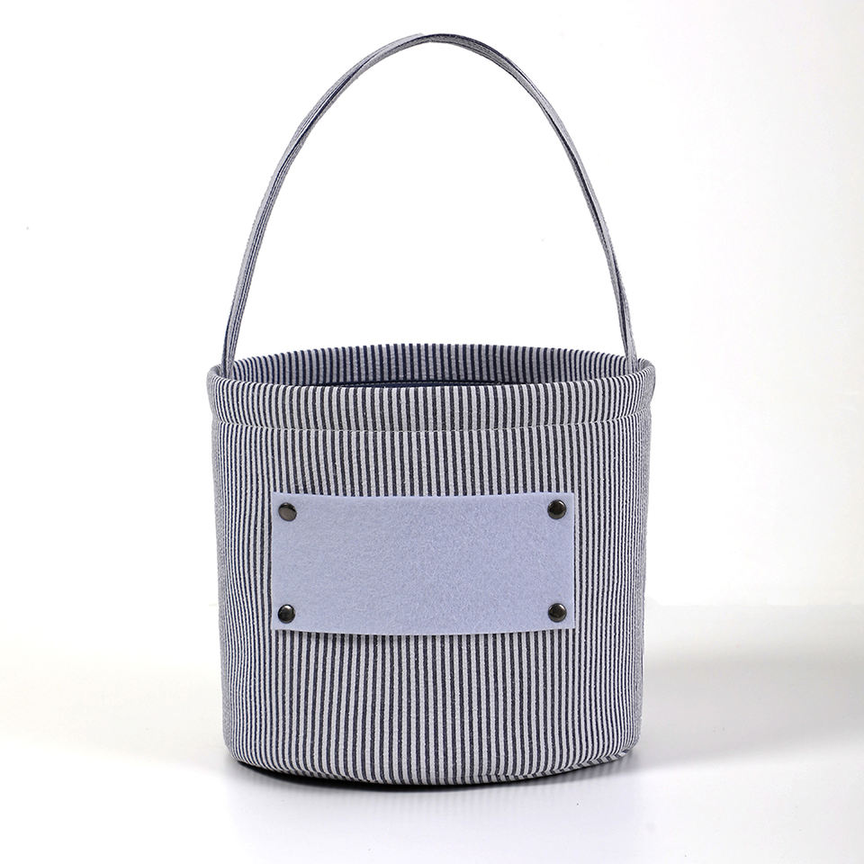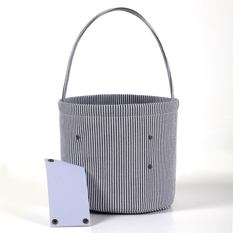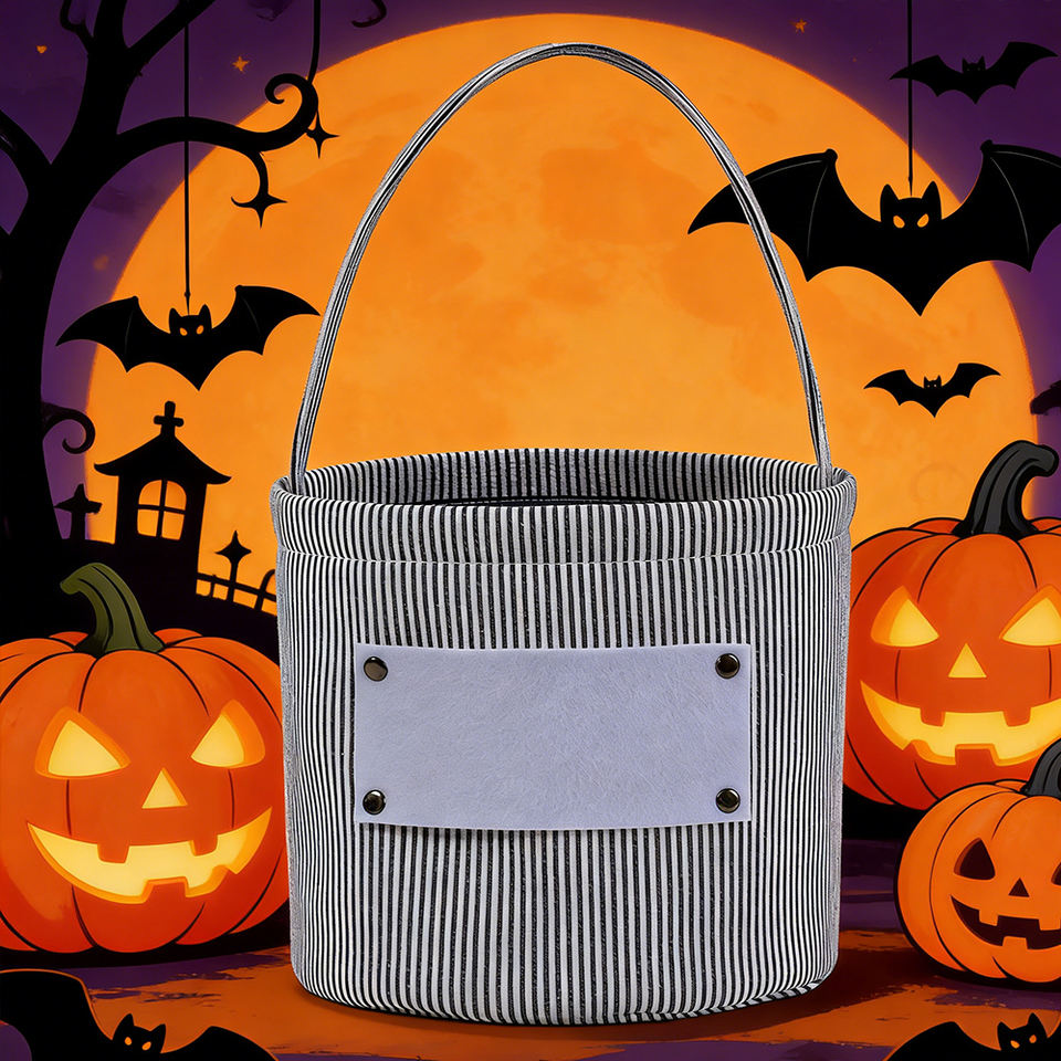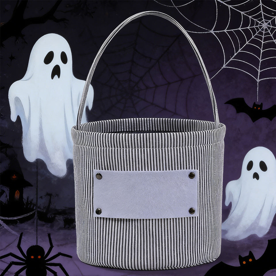 Secchiello di Halloween in tela a righe personalizzato all'ingrosso, riutilizzabile, per dolcetti o scherzi, cestino portatile per caramelle per bambini
