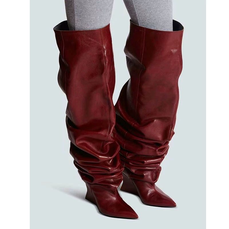 Commercio all'ingrosso personalizzato largo polpaccio tacco a punta grandi dimensioni stropicciato cuoio lungo al ginocchio stivali alti per le donne
