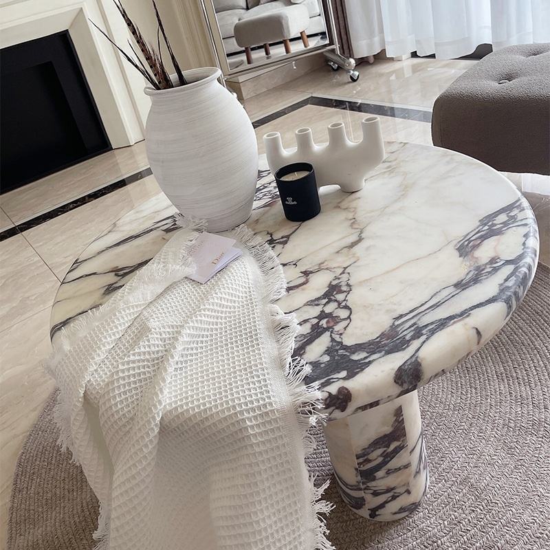 Tavolino da Caffè Rotondo in Marmo Calacatta Viola con 3 Gambe, Design Semplice Stile Arredamento Francese, Personalizzato all'Ingrosso