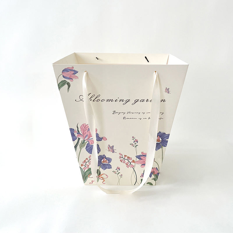 Sacchetti di carta a fiori trapezoidali con Logo stampato personalizzato all'ingrosso stile Boutique Tote Bag Design OEM & ODM