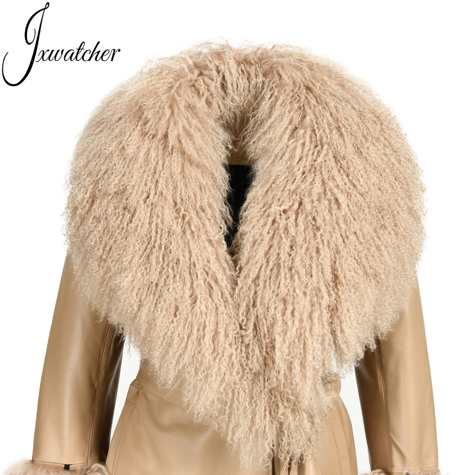 Wholesale Double Breasted Real Sheepskin Coat Mongolian Fur Collar Autumn Lapel Trench Genuine Leather Coats With Fur for Ladies
