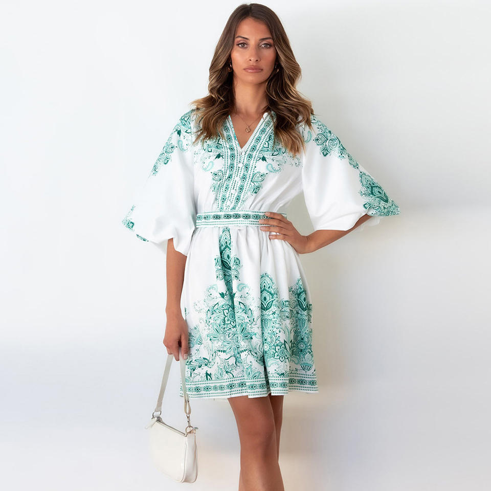 Wholesale Floral Print Vintage Beach Short Dresses Women Lantern Sleeve High Waist V-Neck Robe Courte De Plage