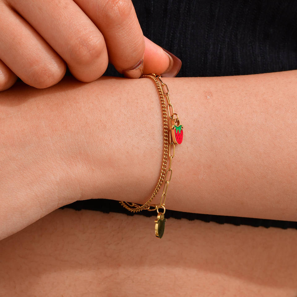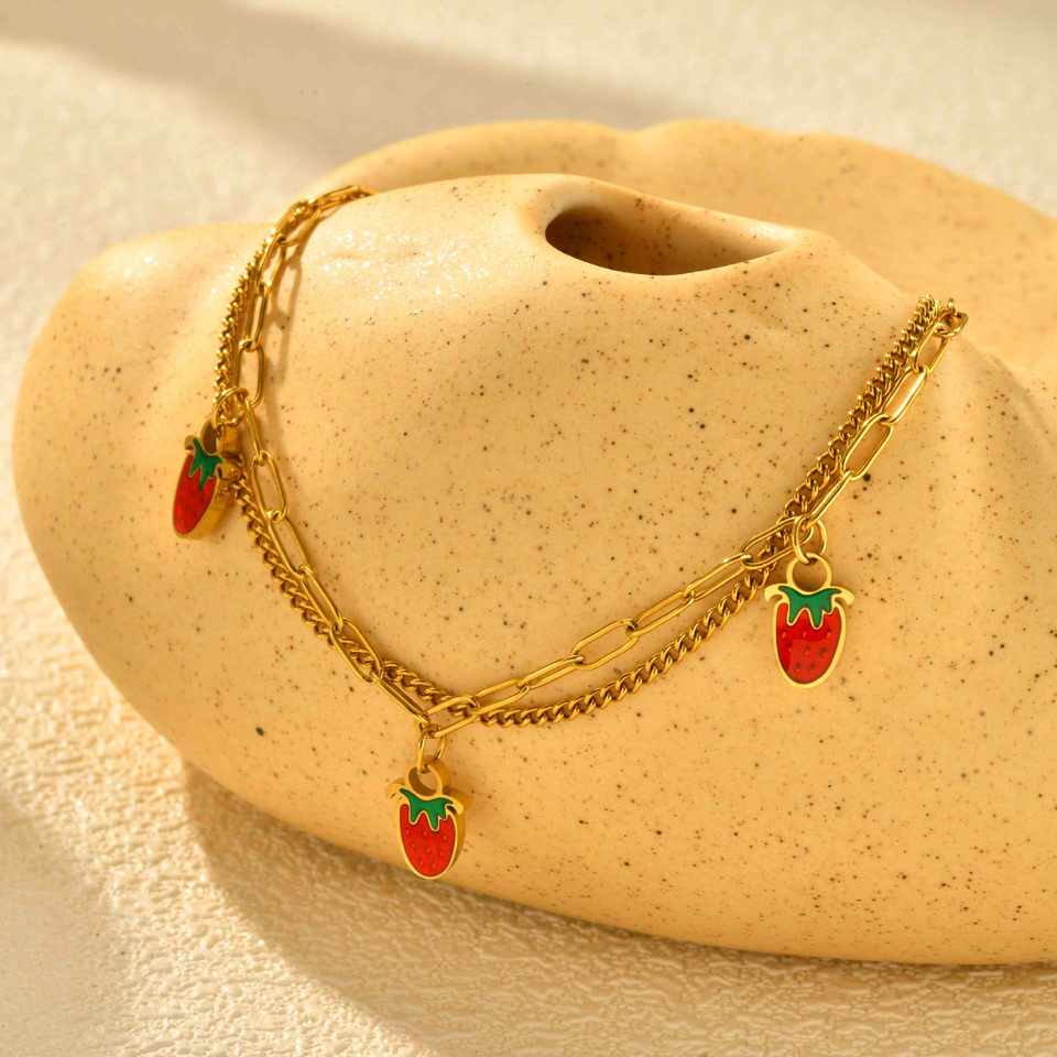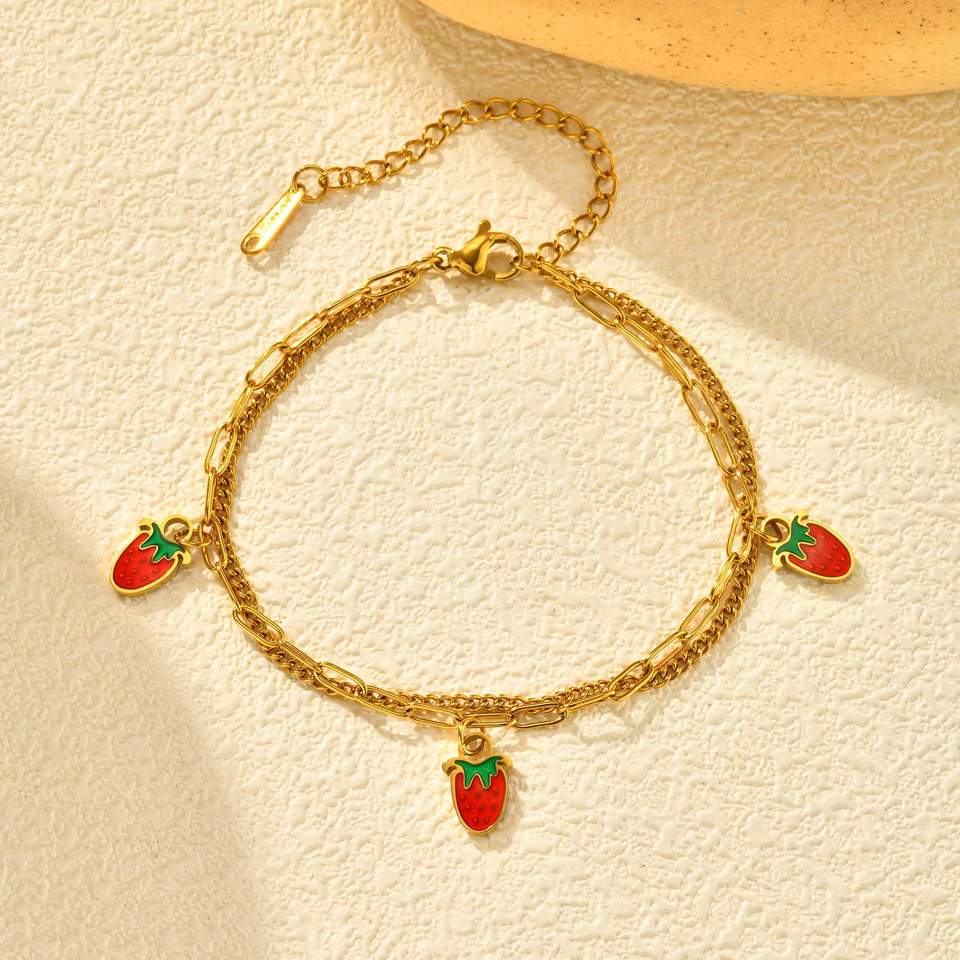 Wholesale Gold Plated Titanium Steel Double Strawberry Charm Bracelet Girls' Sweet Ins Wind Style Stainless Steel Niche Jewelry