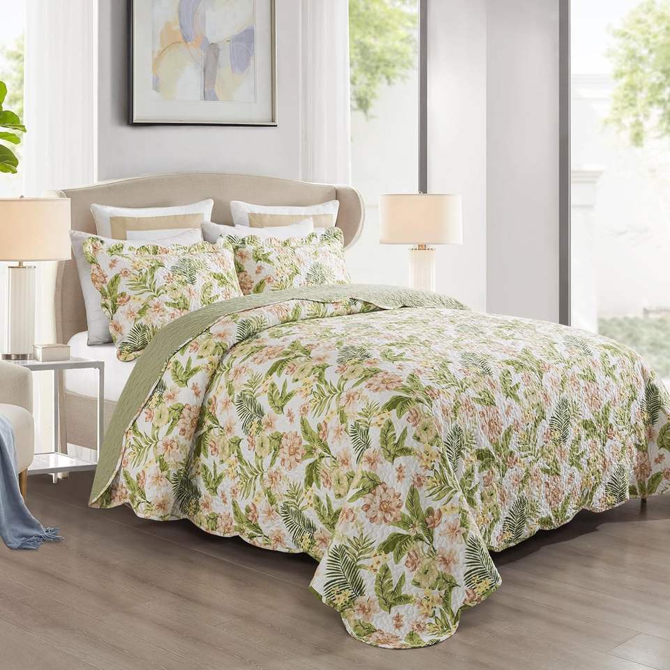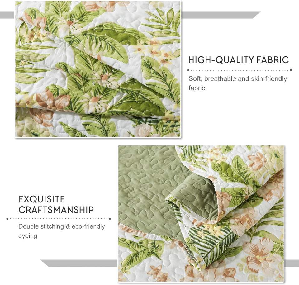 Wholesale Green Leaves and Flowers Reversible Soft Lightweight Coverlet Bedspread for All Season