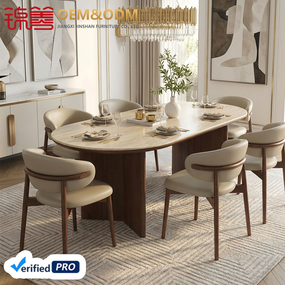 Tavolo da Pranzo all'Ingrosso di Tendenza con Supporto in Legno Massello e Piano in Lastra di Roccia di Travertino in Stile Moderno per Sala da Pranzo