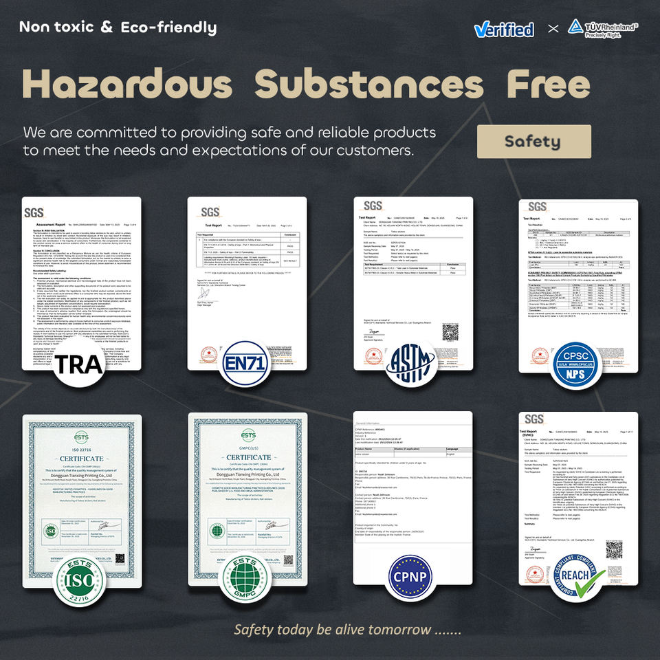 ISO9001/ GMPC/ CPNP/ ASTM/ CPSIA/ EN71/ REACH/ CE/ TRA/ ROHS